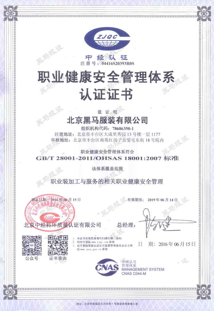 黑馬服裝營業執照 黑馬服裝職業健康安全管理體系認證證書 黑馬服裝機構信用代碼證 質量管理體系認證證書